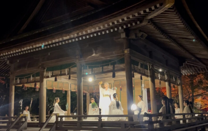 京都・亀岡にある出雲大神宮。元出雲と言われる由緒正しい神社であり、紅葉の美しさでも有名です。11月23日は紅葉ライトアップされた中での「夜間ライトアップ奉納」となります。一般参拝の方も多いため見学の際は場所を譲り合ってご覧いただけると幸いです。詳細はお問合せください。